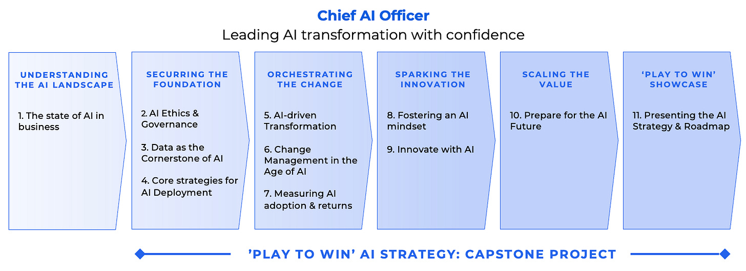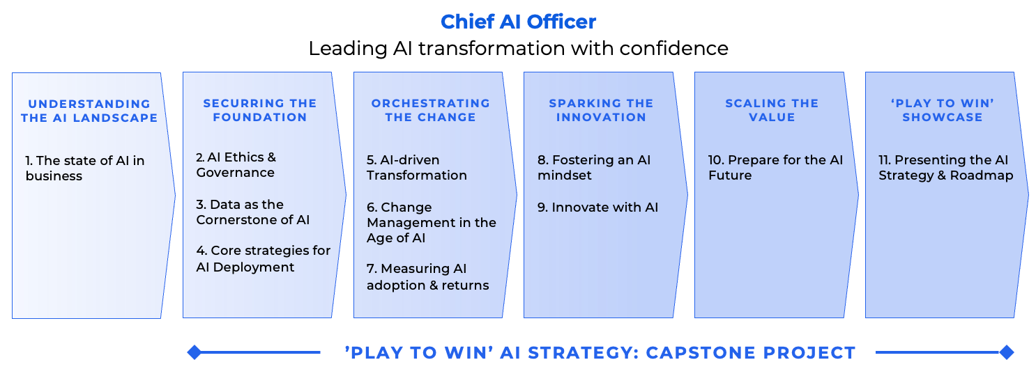 A leadership track for current or emerging CAIOs to build the operating system for AI: strategy, governance, responsible use, capability building, and measurement.