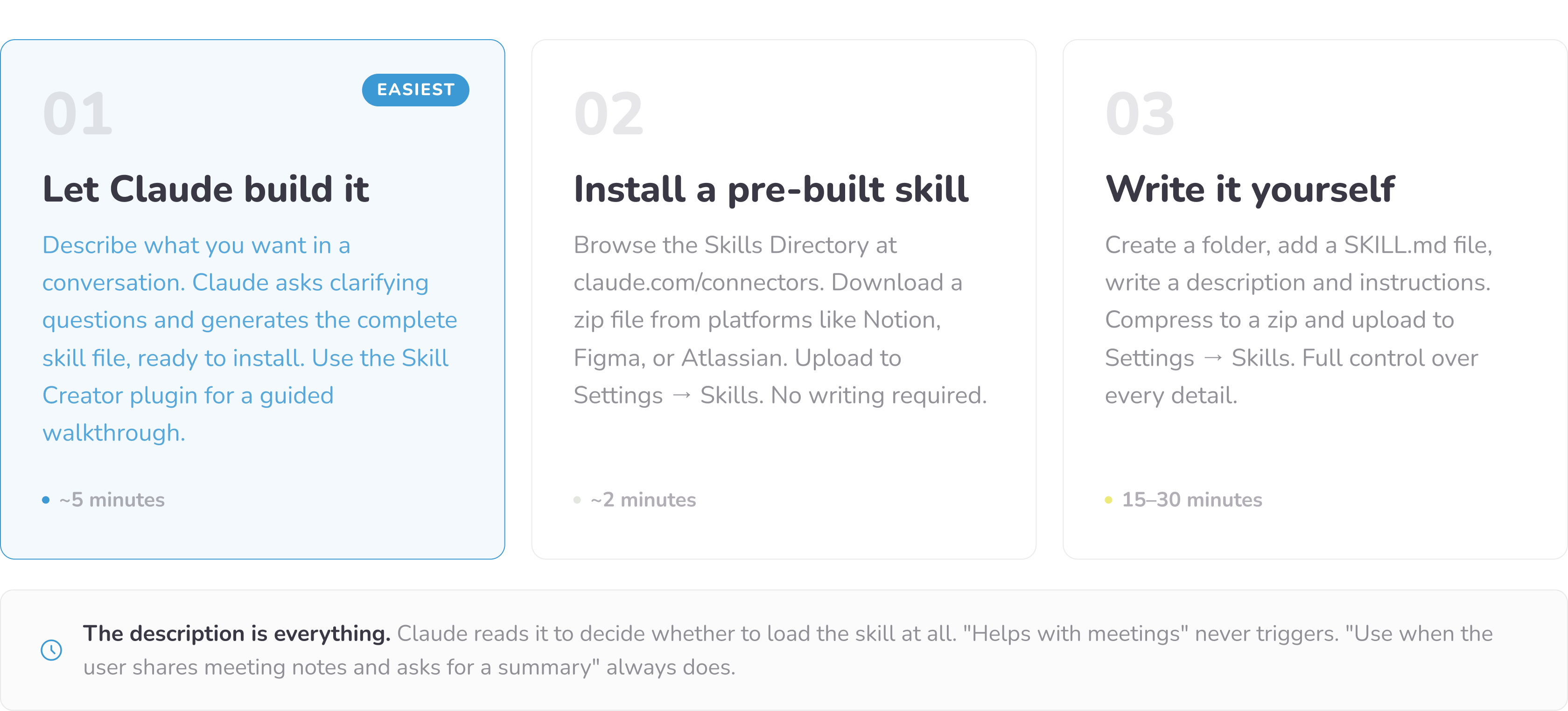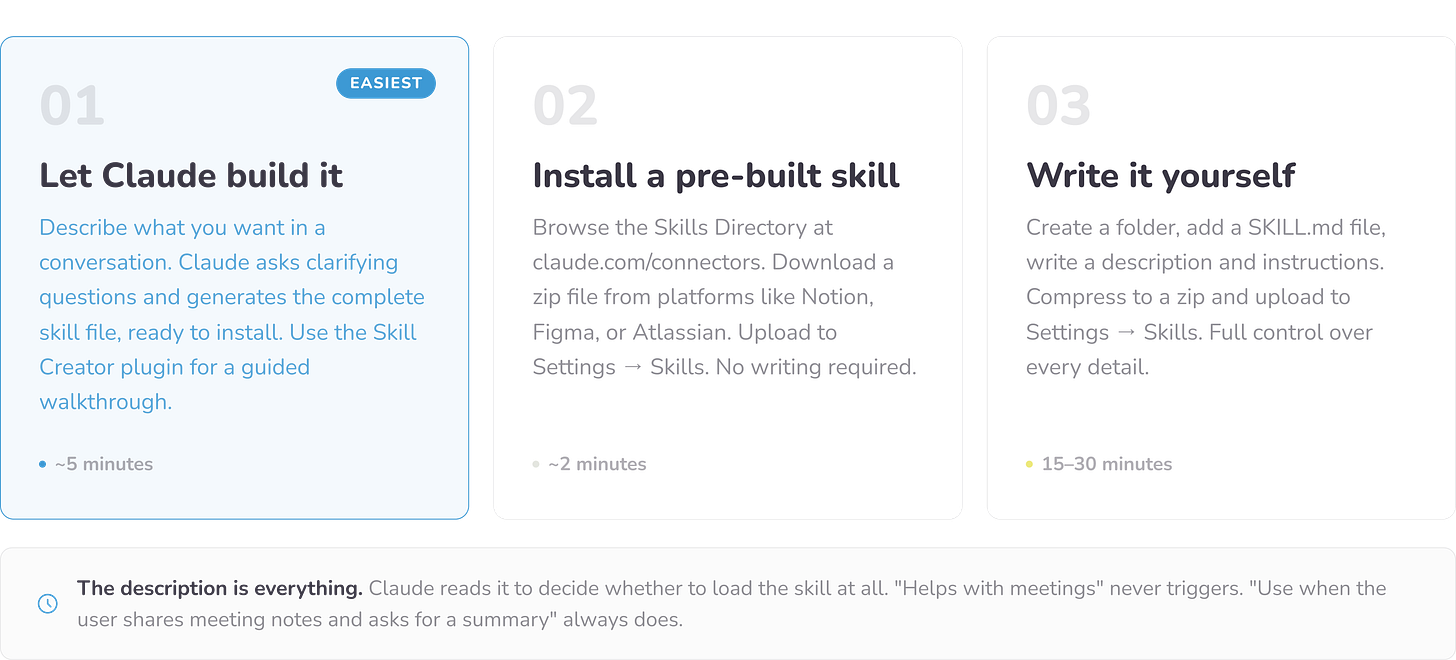Whichever route you take, the one thing that determines whether a skill works is the description. Claude reads it to decide whether to load the skill at all, so it needs to be specific. “Helps with meetings” will never trigger. “Use when the user shares meeting notes or a transcript and asks for a summary or follow-up” will trigger reliably every time.