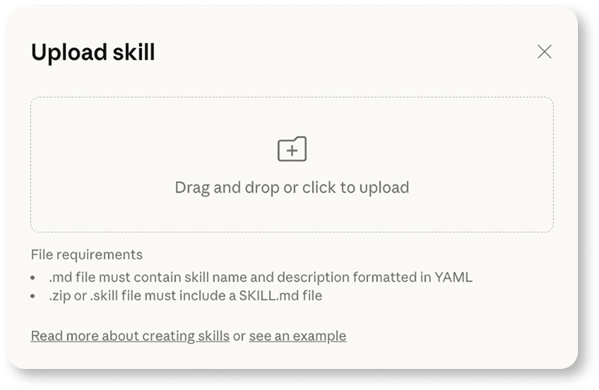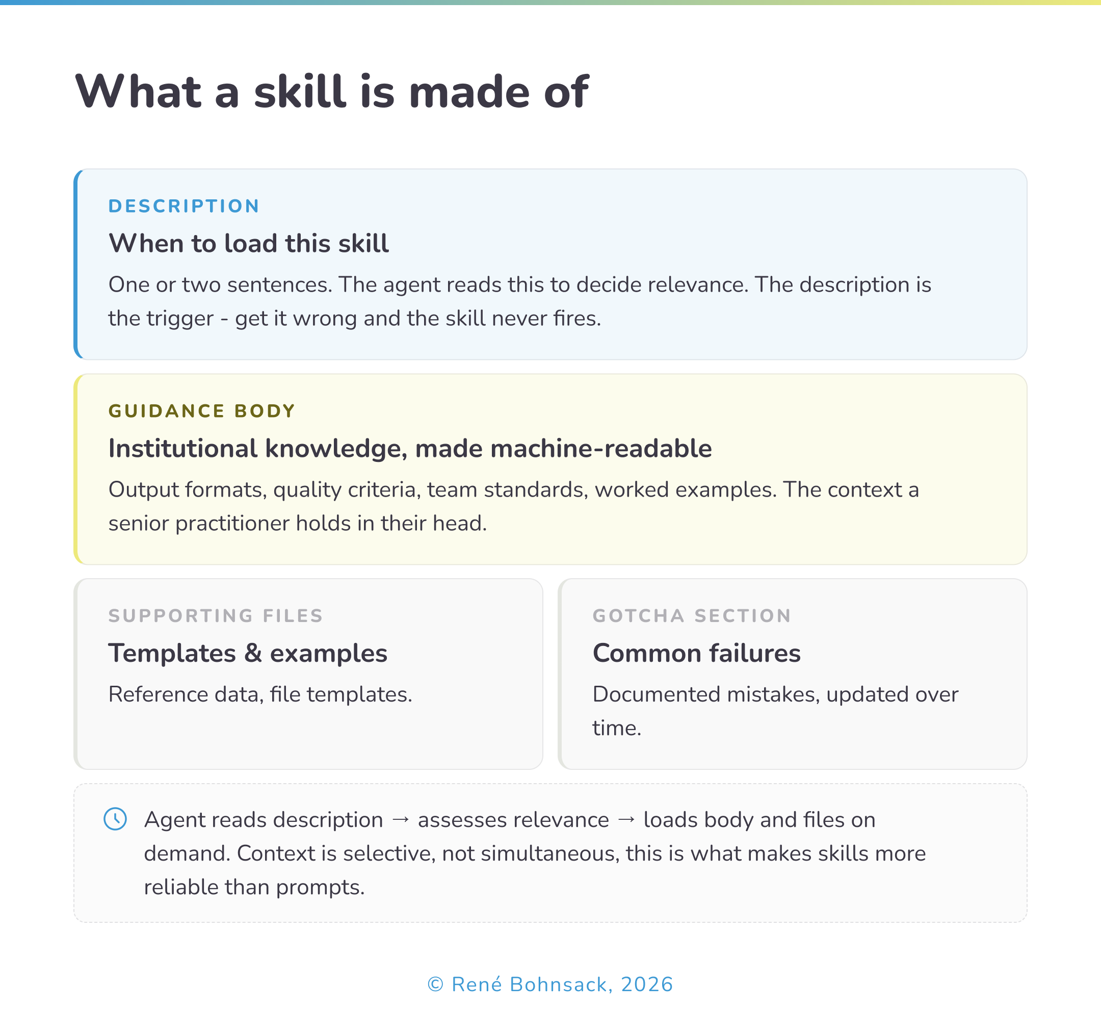 The distinction matters more than it initially appears. A prompt tells the model what to do right now. A skill tells the model what it needs to know in order to do a category of work reliably, every time, regardless of who initiates the task or which conversation it appears in. A prompt is a message. A skill is institutional knowledge made machine-readable.