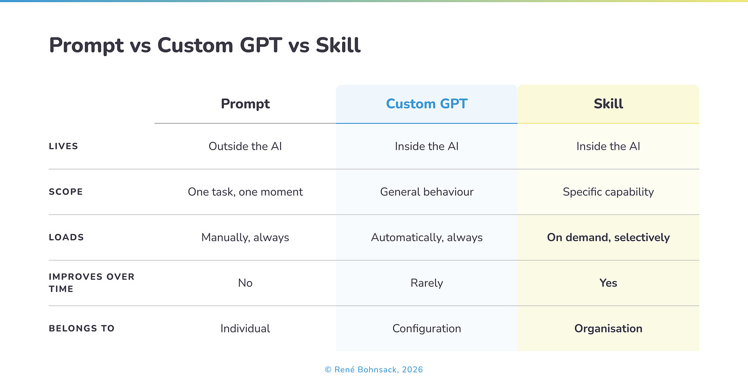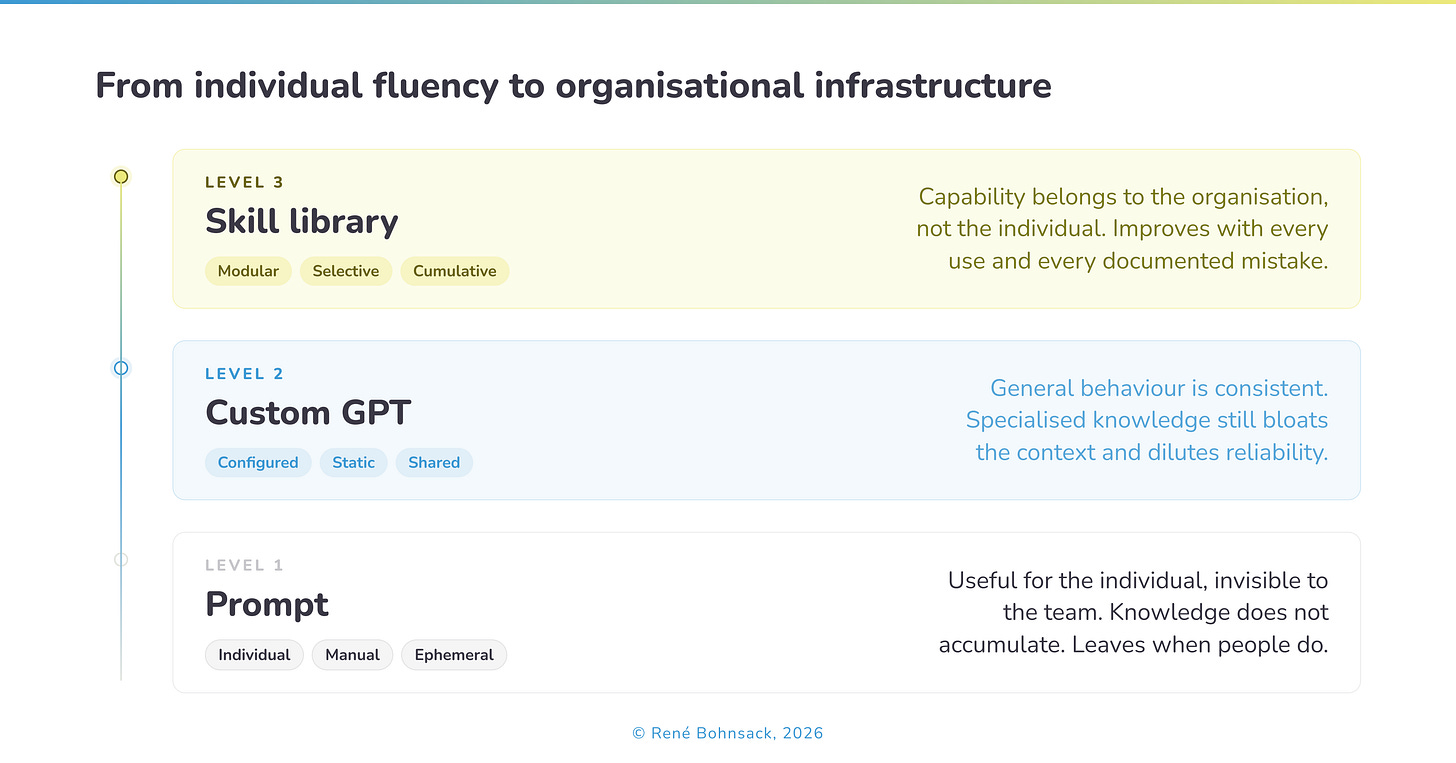 Skills are the mechanism by which individual fluency becomes organisational infrastructure. The investment is higher than writing a prompt and the design discipline is more demanding. But a well-built skill library grows in value over time, improves with use, and belongs to the organisation rather than to any individual practitioner.