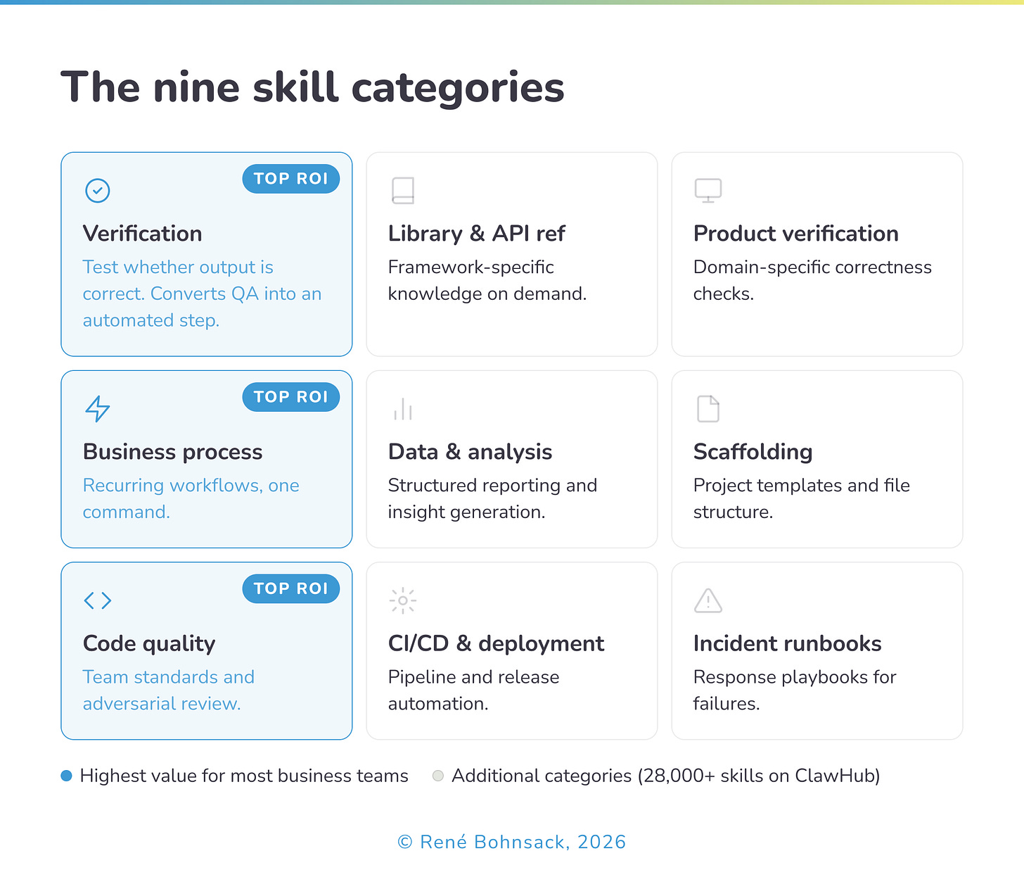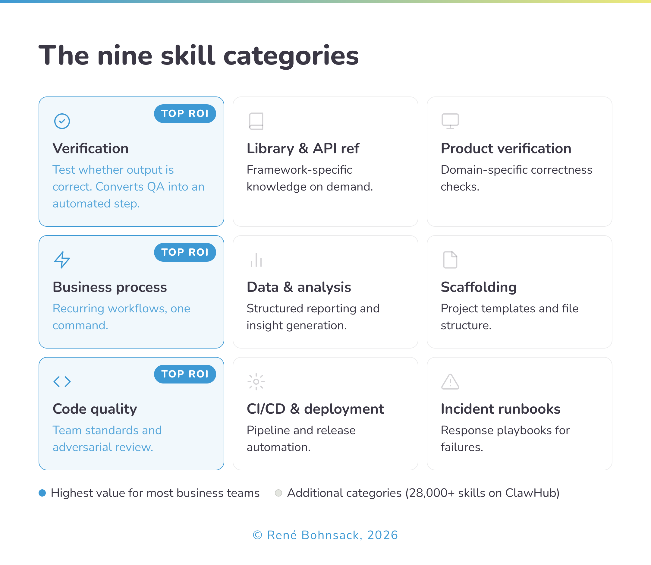 When the team at Anthropic audited a large library of community-built skills, they found that the most valuable ones clustered into recognisable patterns. The nine categories they identified span the full range of professional work, from library and API reference to incident runbooks and infrastructure operations. For most business teams, three categories account for the majority of the value.