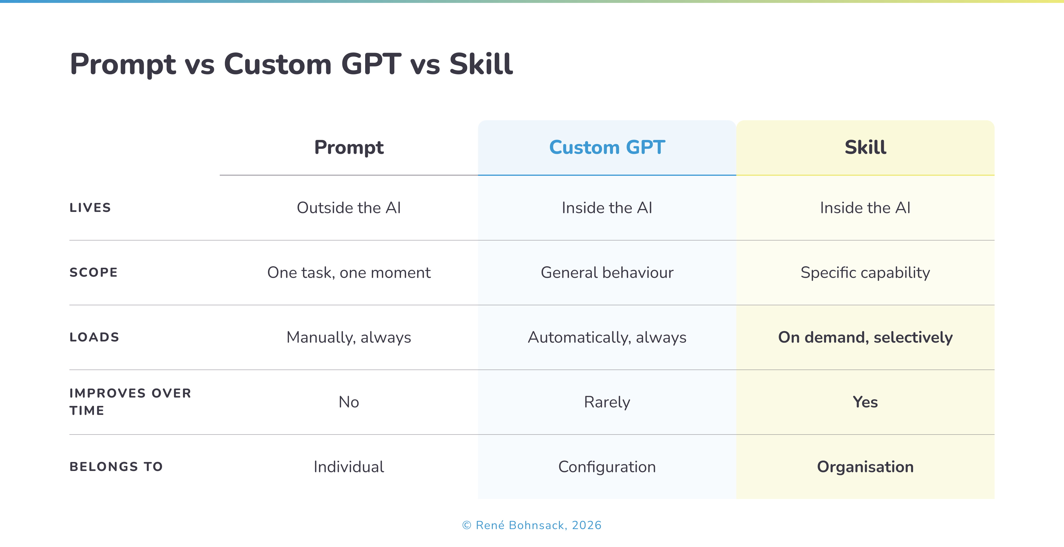 We have built skills for our own content and client workflows at Zeroto100, and the difference between a prompt we share and a skill we maintain is not technical. It is the difference between a good idea and an institutional habit. The concept of skills was developed to close exactly that gap.