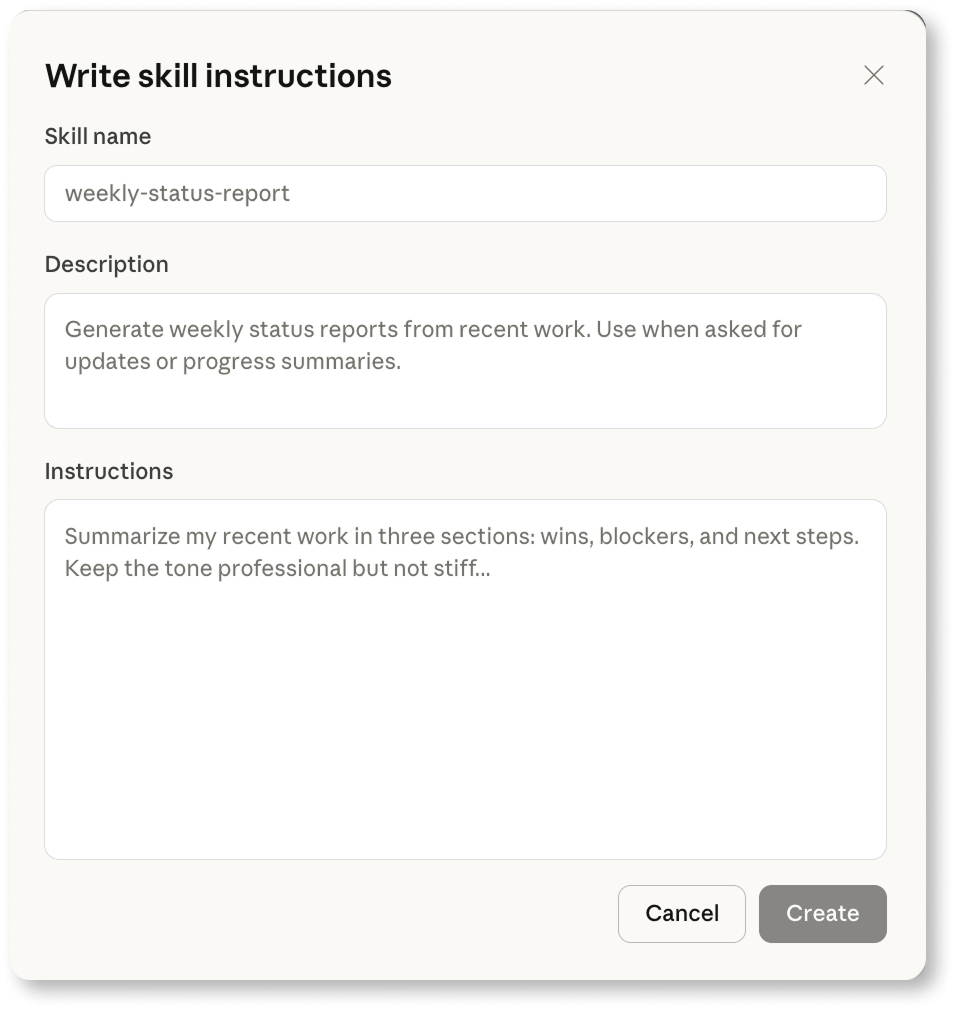 Route 1 — Let Claude build it for you (easiest). Open a conversation in claude.ai and simply describe what you want: “I want a skill that summarises my weekly team meetings into decisions, action items, and open questions. Can you build it for me?” Claude will ask a few clarifying questions and generate the complete skill file, ready to install.